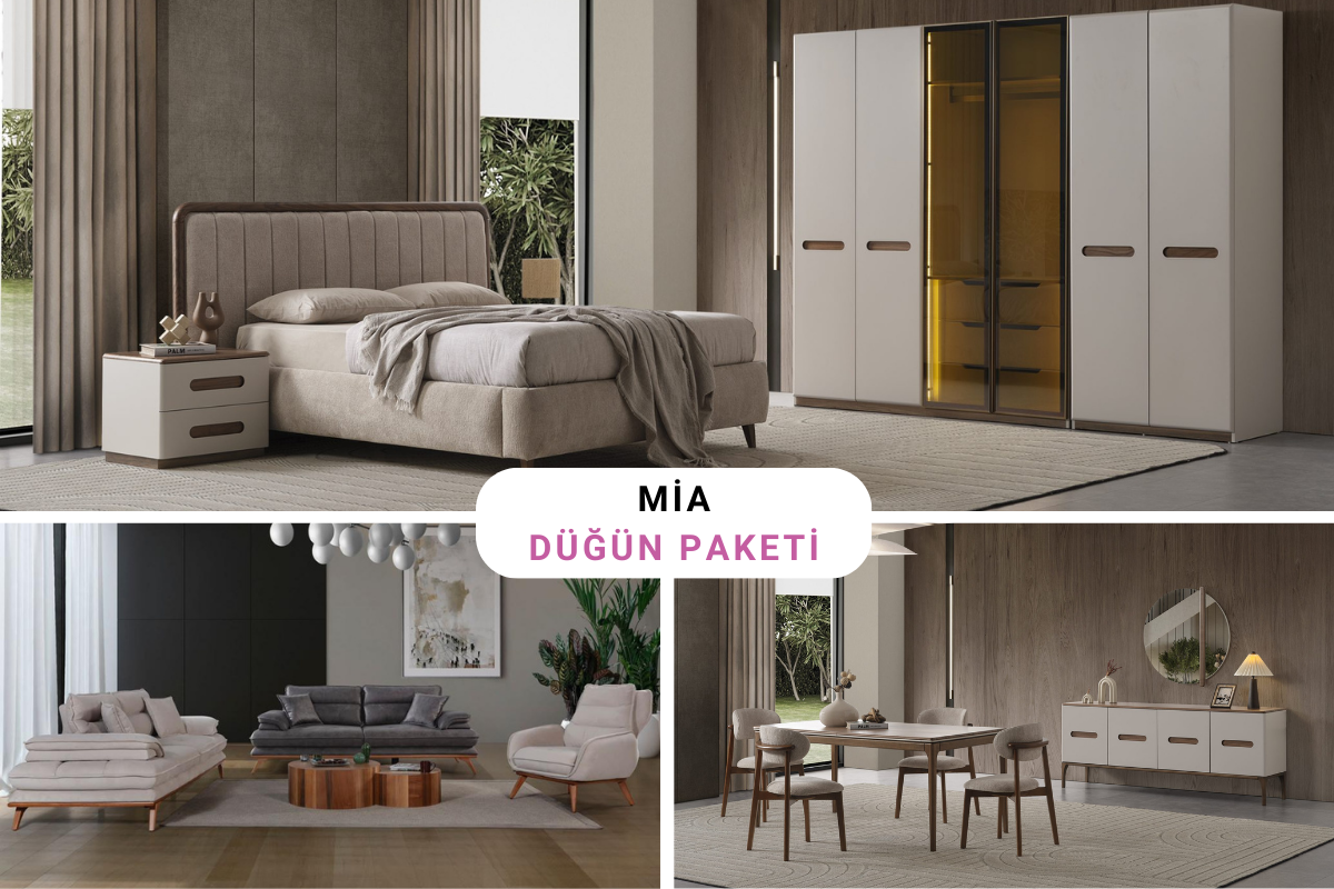 Takım İçeriği | Düğün Paketimiz: Yatak Odası Takımı (6 Kapaklı Dolap + Başlık + Baza + Şifonyer ve aynası + 2 Komodin) Yemek Odası Takımı (Masa + 6 Sandalye + Konsol + Aksesuar) Koltuk Takımı(3+3+1)’ndan oluşmaktadır. Ürün detaylarına ilgili ürünün sayfasından inceleyebilirsiniz. |