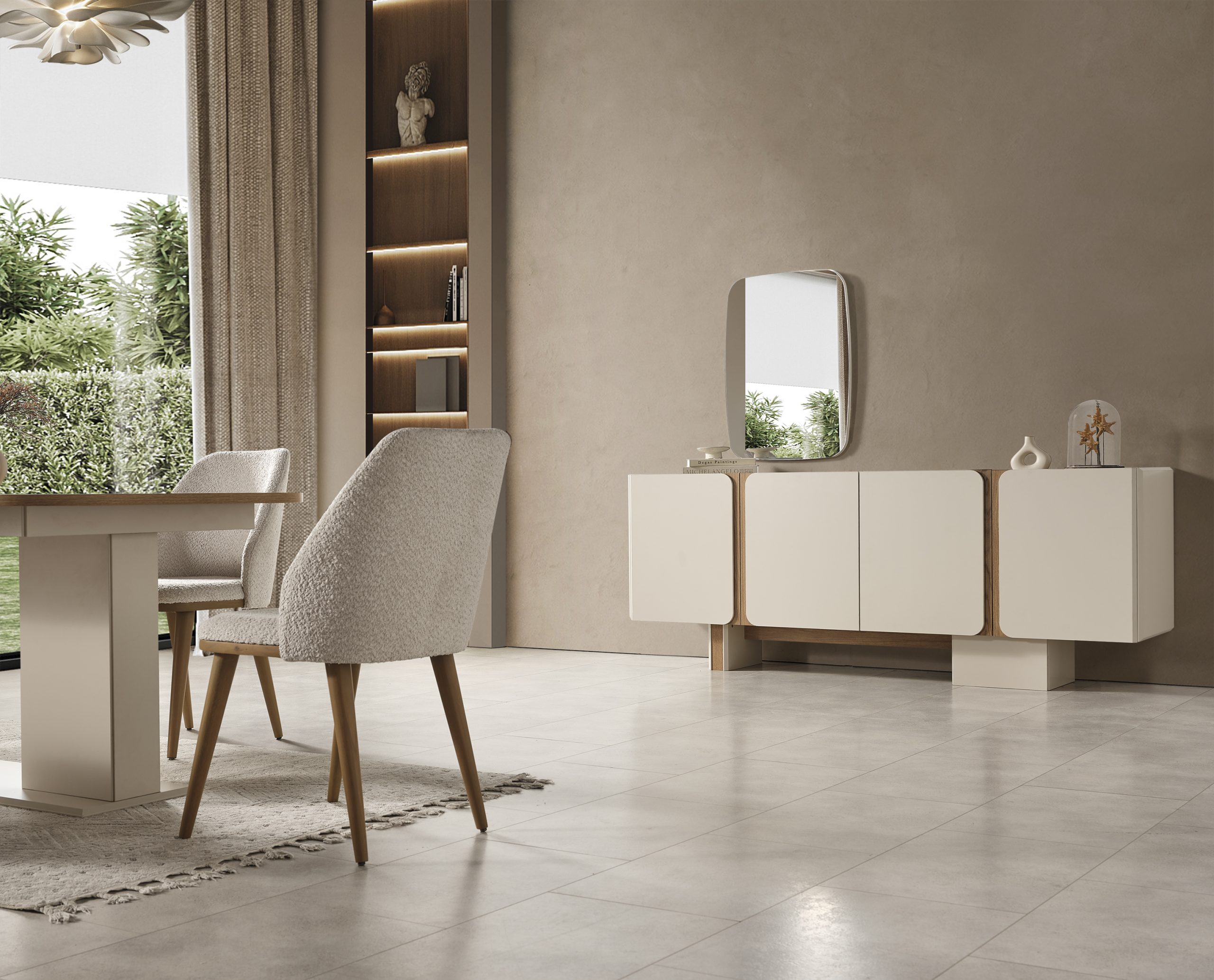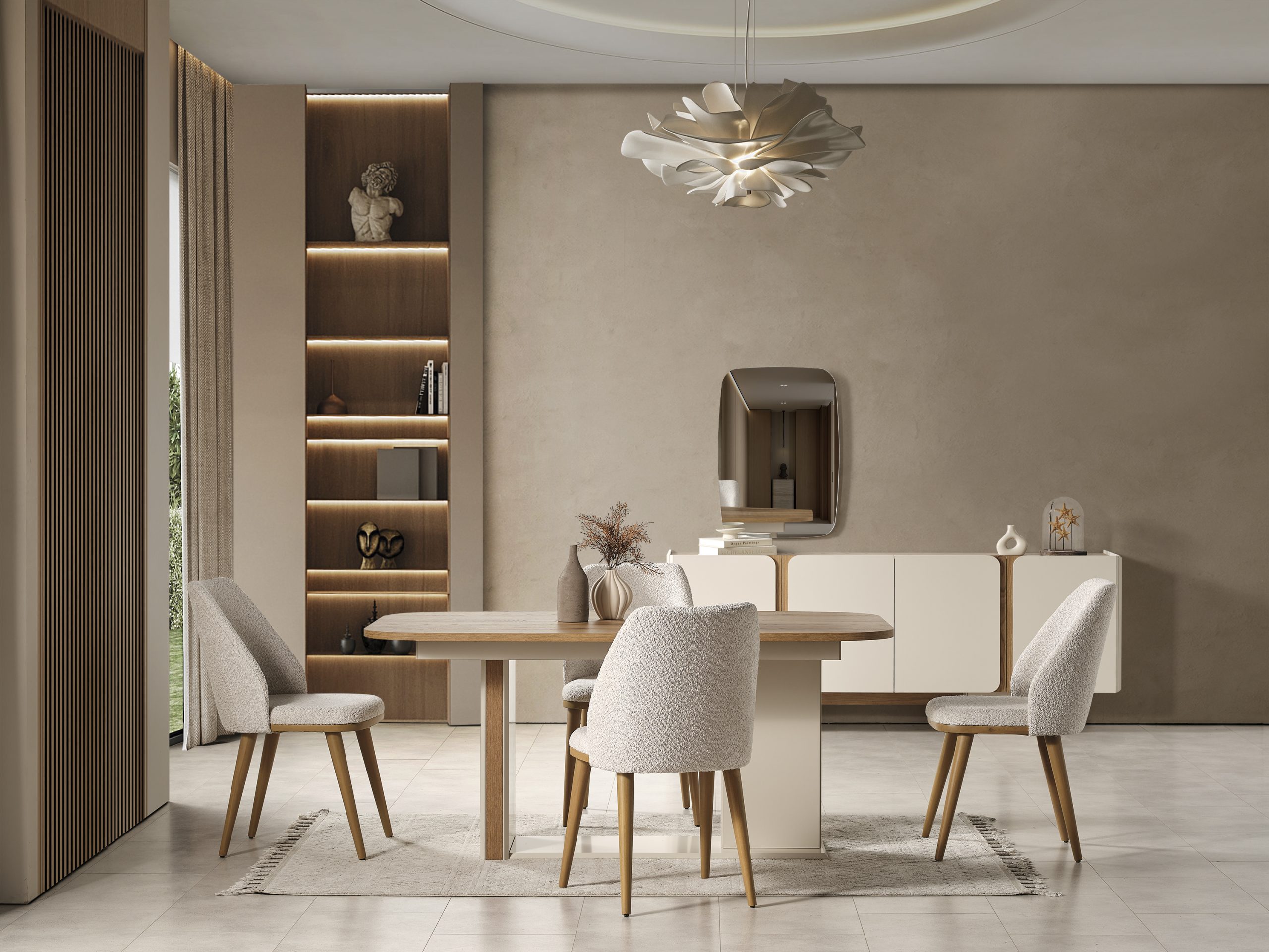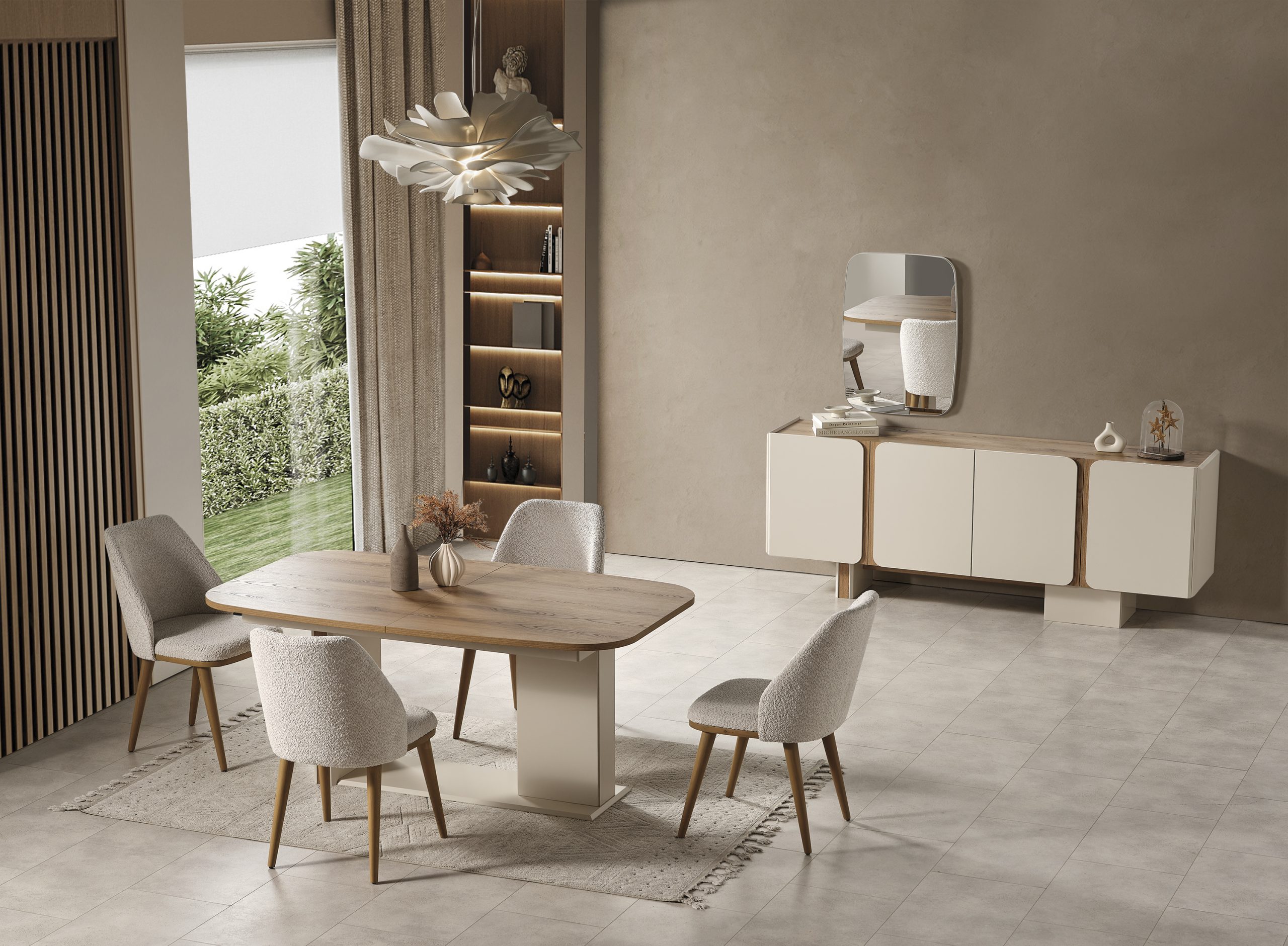 Takım İçeriğiYemek Odası Takımı, 1 adet masa, 6 adet sandalye, 1 adet konsol ve aynasından oluşmaktadır. İnegöl Mobilya Kalitesiyle Üretilmiştir.
